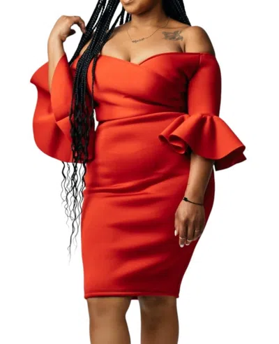 Off The Shoulder 3/4 Midi Dress In Red