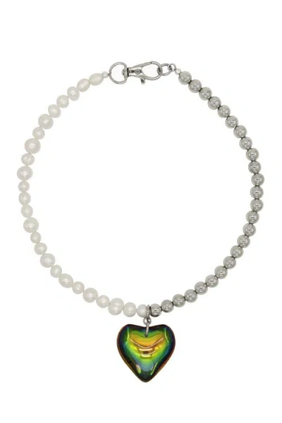 Freshwater Pearl And Steel Bead Necklace With Heart Charm In Metallic
