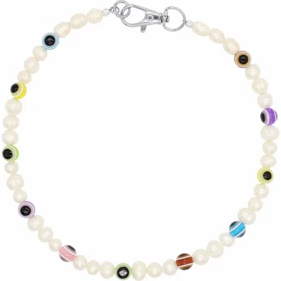 Pearl Necklace With Multicolor Evil Eye Beads In White