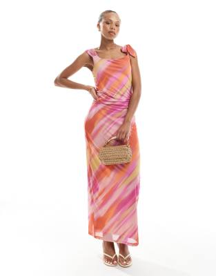 Mesh Asymmetric Off The Shoulder Maxi Dress In Pink