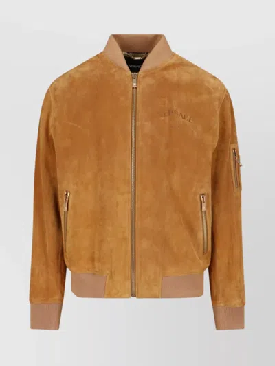 Ribbed Cuffs Sleeve Zip Pocket Jacket In Brown