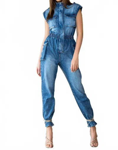 Cargo Cool Denim Jumpsuit In Medium Stone In Blue