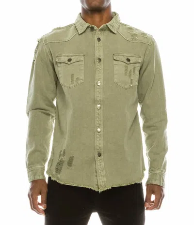 Long Sleeve Button Up Distressed Denim Jacket In Olive In Green