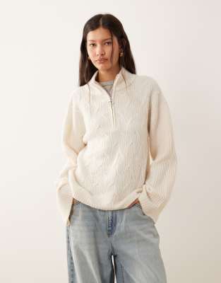 Boxy 1/4 Zip Waffle Knit Top With Faux Pearl Zip Detail In White