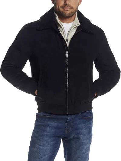 Microsuede Bomber Jacket With Detachable Faux Fur Collar In Black