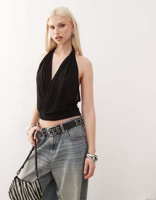 Plunge Drape Front Halter Neck Top With Low Back In Black