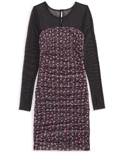 Kids' Big Girls Long-sleeve Printed Mesh Combo Dress In Miscellaneous (black Multi)
