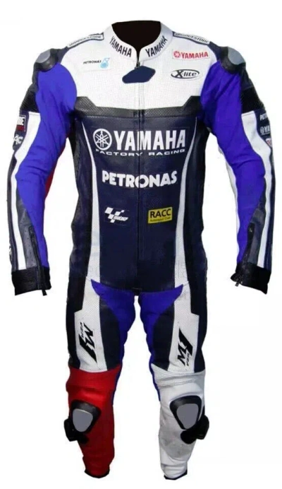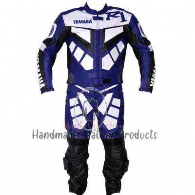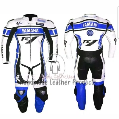 Pre-owned R1 White Blue Men Racing Biker Leather Suit, Jacket With Safety Pads