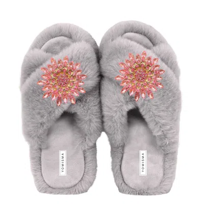 Women's Faux Fur Slippers - Global Recycled Standard Certified With Grey Tourmaline Jewel Embellishm