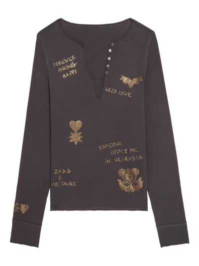 French brand Zadig &Voltaire is a ready-to-wear fashion label established in 1997 by Thierry Gillier, the grandson of Andre Gillier and co-founder of Lacoste. The brand's name was inspired by the Voltaire book, Zadig ou la Destinee. The Zadig & Voltaire style (jeans, boots and leather jackets) gained a solid reputation for accessible, high quality ready-to-wear and soon established a new meaning for 'luxury'.