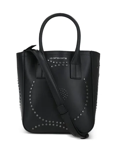 black leather stud embellishment circle graphic double top handle adjustable shoulder strap