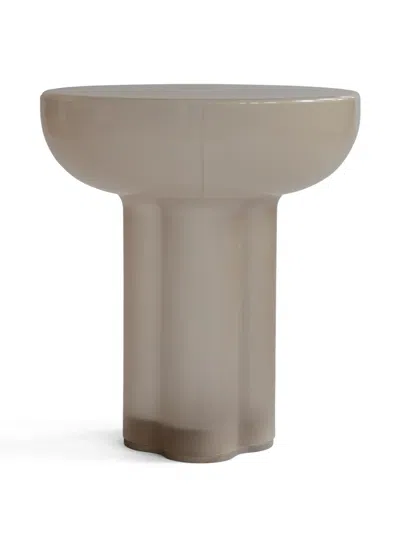 Evoking the bold, rounded shapes and subdued, natural tones of the ’70s, the 'Crown' table by 101 Copenhagen is a graphic sculptural statement. Defined by four merged cylindrical legs and a circular tabletop, this commanding yet fluid design by Kristian Sofus Hansen & Tommy Hyldahl effortlessly blends into spaces. The table is stabilized and strengthened by a strong wooden base with internal metal support. In its smoked desert iteration, it takes on a warm, grey translucent hue, with a hint of sand. The effect is like smoke or fog. Whether used as lamp- or bedside tables, or standalone in a hall, the 'Crown' table radically transforms spaces.
