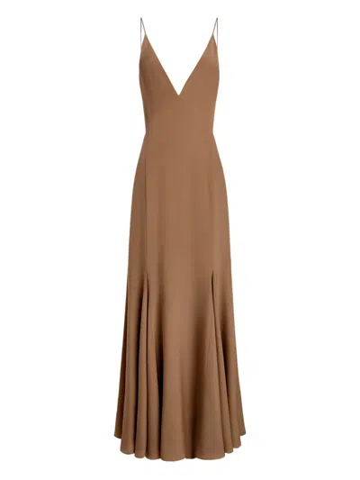 camel V-neck spaghetti straps fitted bodice flared skirt silk fabric