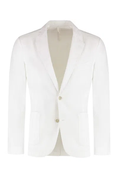 Single-breasted two-button jacketLapel collarTwo front pockets and chest pocketBack slit hem100% Linen