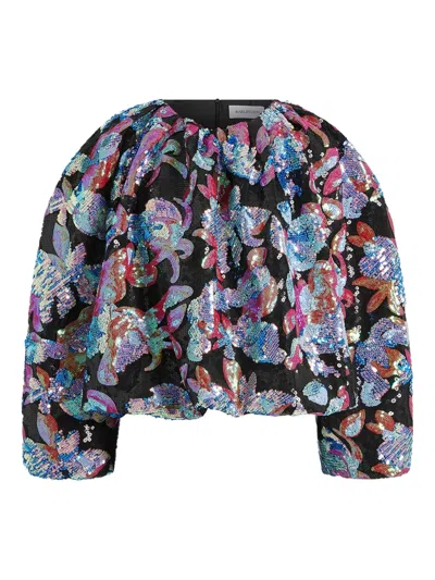 black sequin embellishment floral pattern gathered neckline long sleeves balloon sleeves