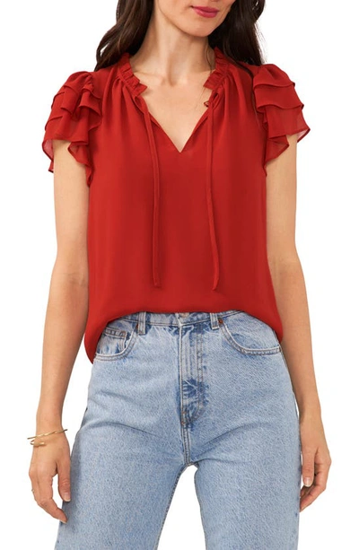 1.STATE Flutter Sleeve Split Neck Chiffon Blouse In Mahogany Red
