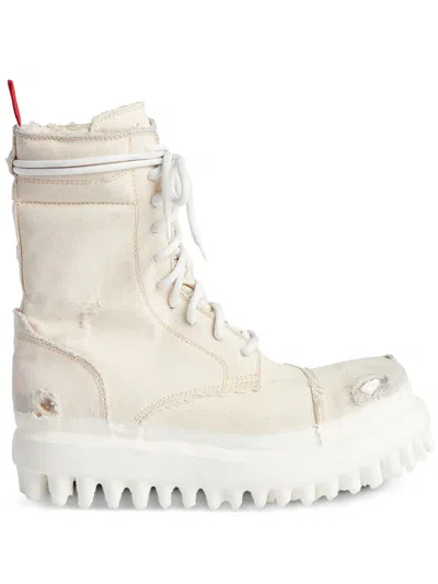 The 424 Miner Boots in technical canvas featuring heavy distressing and raw edges throughout, a lace-up closure, contrasting pull tabs at the heels, and an exaggerated lug platform sole with a waxy dipped-effect treatment.. Due to the silhouette of this shoe, we suggest going a size up.