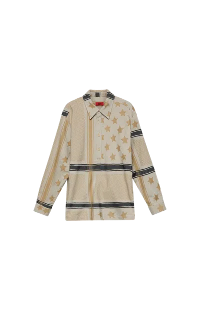 The 424 Overshirt in a graphic stripe and star knit jacquard fabrication featuring a tunic length, half button front closure, and side pockets.