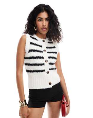Fluffy Knit Button Up Sleeveless Top In Black And White Stripe-multi