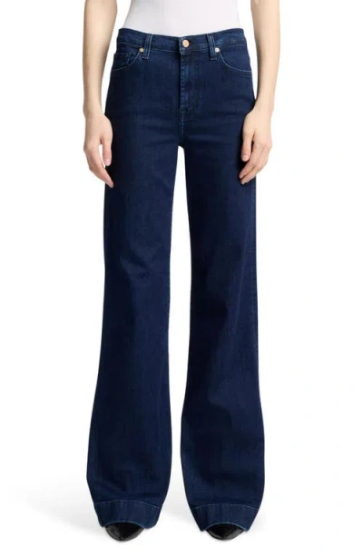 Pair these wide leg jeans with mules, slides or your favorite strappy sandals.Introducing the Slim Illusion Modern Dojo by 7 For All Mankind, an effortlessly stylish addition to any wardrobe. Crafted from a Comfort Fit Cotton Blend, the pants boast a flattering high rise and wide leg, perfect for embodying the Quiet Luxury trend. Featuring a classic dark wash, these solid-colored flares are enhanced with a practical button closure and pockets for convenience. Designed for fall occasions like Thanksgiving travel, simply machine wash and lay flat to dry to maintain their impeccable look.