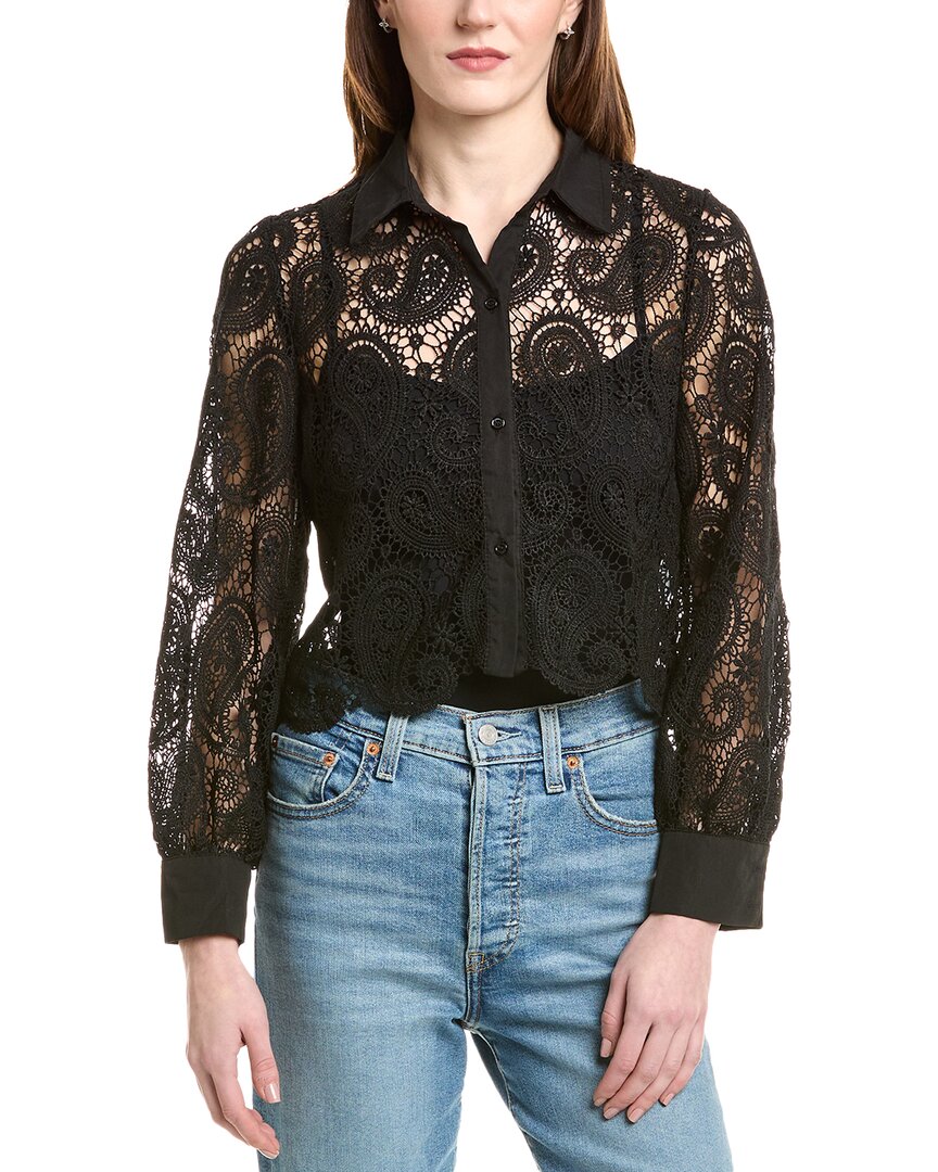Introducing the 70/21 Shirt from our women's clothing collection. This elegant blouse features a chic lace design, spread collar, blouson sleeves, button cuffs, and scalloped trim for a sophisticated look. The black color adds a touch of versatility to your wardrobe, while the button front closure offers easy wear. Made from 100% polyester, this shirt is machine washable and imported for your convenience. The approximate length of 18 inches from shoulder to hem and the model is 5'10' wearing a size small. Please note that measurements may vary slightly by size. Add a touch of elegance to your wardrobe with the 70/21 Shirt.