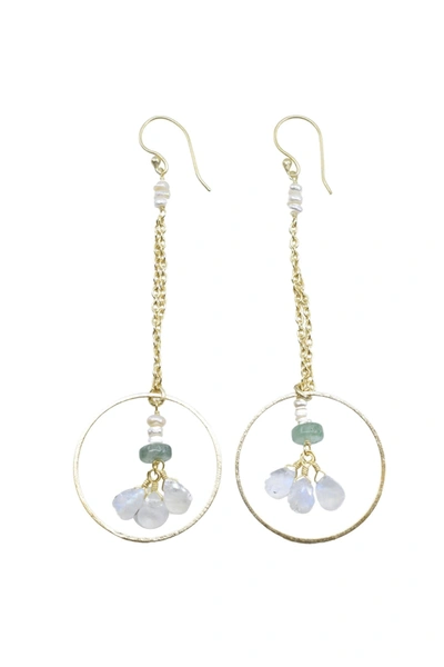 A Blonde and Her BagPearl Accented Gold Chain Dangle Earrings with Green Strawberry Quartz and Moonstone Hoop Drop.Gold dangle earring with pearl accented chain leading to a gold hoop drop with a green strawberry quartz bead and three moonstone drops.Size - 3 1/2" Length Hypoallergenic This product is made of metal alloy (silver and copper and other metal alloy) with high quality plating (It will last for a long time without tarnish). Handmade with love in Sausalito, California