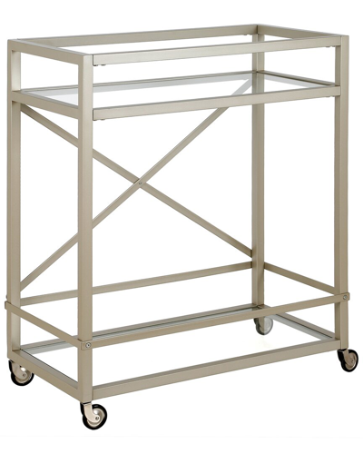 Color/Finish: Silver Satin Nickel Design Details: This Serving Cart Features Streamlined Design And Modern Style. Two-Tier Glass Shelves Add To Its Efficient Usage. It Features Secured Top Tray With Handles On All Sides While The Bottom Is Secured With Elevated Metal Bars. The Wheels Provide Easy Mobility While You Are Hosting Any Party. Measurements: 30In X 15In X 36In 1 Shelf/Shelves Metal/Glass Clean With A Soft, Dry Cloth; No Harsh Chemicals Or Abrasive Cleaning Materials. Fully Assembled Imported