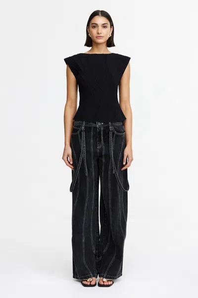 Introducing the Eagleton Jean in Black, a statement-making piece that redefines classic denim. These low-rise jeans feature a sleek straight-leg silhouette with a modern twist. Decorative curved seam lines and bold D-ring hardware at each belt loop add an edgy vibe, while additional D-rings at the front waist and back patch pockets are linked by slender fabric straps, creating a striking, fashion-forward detail. - Low-rise, straight-leg jeans- Front zipper fly- D-ring hardware- UnlinedModel is 180cm / 5'11″. wearing an AU 8 / US 4. . Composition: 100% Cotton.