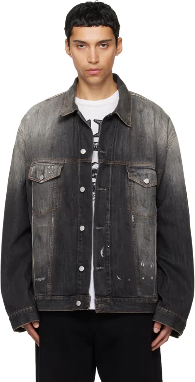 Non-stretch organic cotton denim jacket. · Fading and paint splatter throughout · Spread collar · Button closure · Flap pockets at chest · Welt pockets at waist · Adjustable buttoned barrel cuffs · Adjustable button tabs at back hem · Contrast stitching in tan Supplier color: Black
