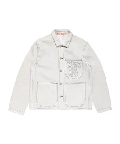 Denim blouson jacket with contrast stitching, featuring embroidered seasonal bow artwork on the chest. Complete with branded buttons and front pockets. Cut to a regular fit.