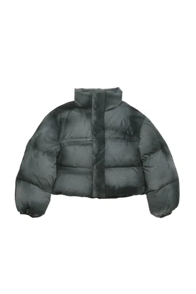 Puffer down jacket features a sprayed finish treatment and a branded logo patch at the back neckline. Complete with a centre front zipper and velcro placket closure. Constructed with an internal adjustable drawcord hem. Cut to a relaxed fit with slightly dropped shoulders and hip length. Relaxed fit . Hip length .Padded down Sprayed finish Water repellent Logo tab centre back Zipper and velcro closure Side seam pockets Internal pocketElasticated cuffs Internal adjustable drawcord Model is 180cm/ 5'11 and wears a size 36Style ID: FN-WN-OUTW000958Main material made from recycled nylon. Filling made from recycled down and recycled feathers. Shell: 100% Nylon, Lining: 100% Nylon, Filling: 90% Duck down, 10% Duck feather