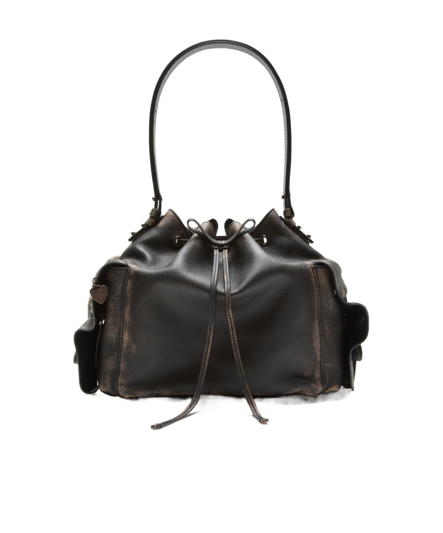 black calf leather drawstring closure heart-shaped charm adjustable shoulder strap