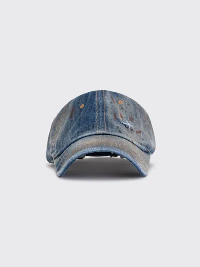 Baseball cap is crafted from non-stretch denim in a wash with tinted and painted mark details. The fabric has a slightly rough, uneven texture for a worn-in, vintage look. Complete with logo embroidery on the back and an adjustable D-ring closure.