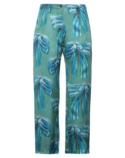 Green trousers from Acne Studios. Fastened with buttons, this straight leg pair is complete with a blue and white bow pattern, two front pockets and one buttoned back pocket. 100% Viscose