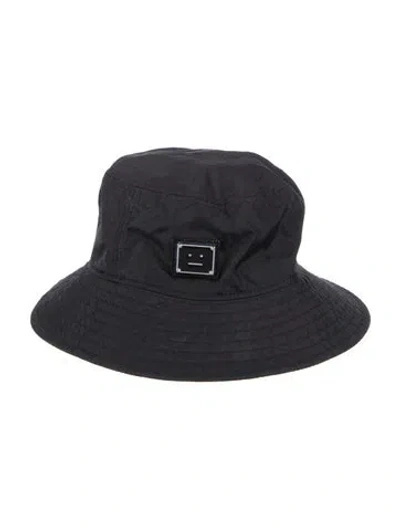 Black Acne Studios bucket hat with silver-tone hardware and metal logo placard at front. | Acne Studios Logo Bucket Hat in Black
