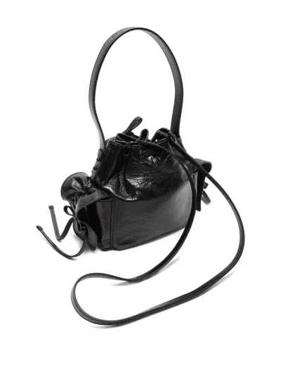black calf leather drawstring closure ruffled detailing detachable shoulder strap heart-shaped logo tag