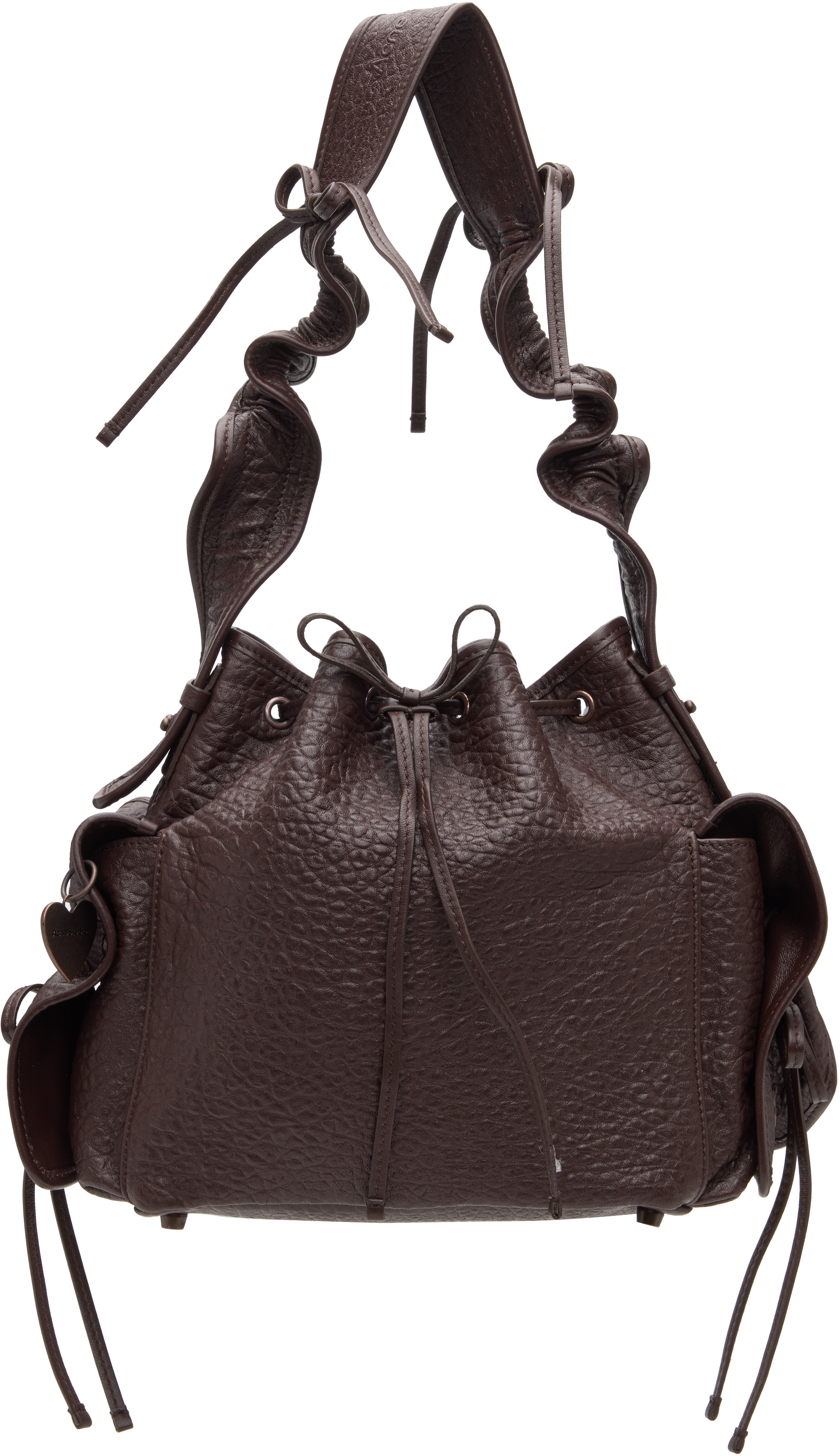 brown textured leather drawstring closure ruffled shoulder strap logo charm