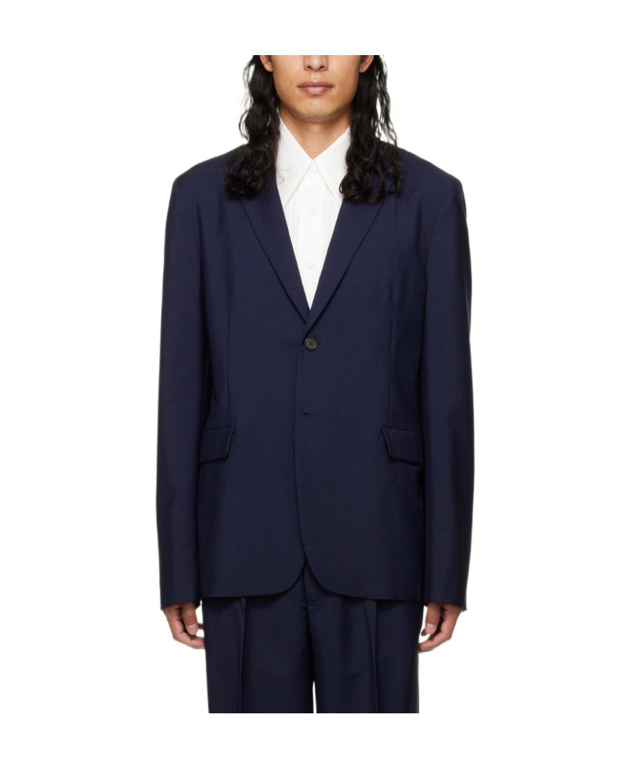 Logo lapel suit jacket, lapel, long sleeves, button opening and closing.