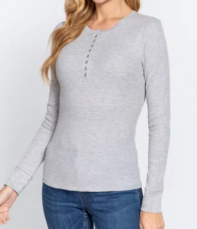 A long sleeve top you can wear with denim, skirts, well.just about anything!The Henley Thermal by Active Basic offers cozy warmth with its soft cotton blend fabric. It features a solid grey color and a classic crewneck design, perfect for layering in any winter wardrobe. The long sleeves and snug fit ensure comfort, while the button closure adds a traditional touch. Ideal for women seeking both style and functionality, this versatile thermal is an essential addition to your seasonal collection.