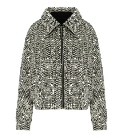 Bomber jacket by Add made from bouclé fabric in shades of white and black. Embellished with mirrored silver sequins that add brightness to the garment. Lined and padded, it features a shirt collar and a front zip closure with logo. Welt pockets, one of which is logoed, applied on the front. Internal pocket for cellphone. Regular fit. Composition: 100% polyester. Lining: 100% polyamide. Padding: 90% down, 10% feathers.