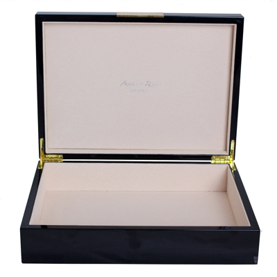 <p>This stunning high gloss Black Box measures approximately 8 x 10.75 inches with an internal size of 24.5cm x 17.5 x 5.5cm, including depth of the lid. All of our boxes have had 20 coats of lustrous hand polished lacquer. </p> <p>Lined in cream suede with a beautiful gold hinge, these boxes are perfect for keeping jewellery and accessories, such as TV remotes and glasses out of sight. </p> <p> <span>Do not leave in prolonged direct sunlight. </span> </p>
