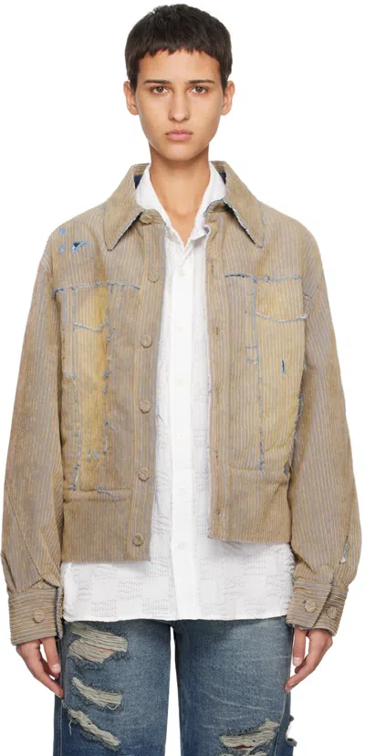 Stretch denim jacket. Raw edges, distressing, fading, and corduroy effect throughout. · Paneled construction · Spread collar · Button closure · Welt pockets · Dropped shoulders · Twisted seams at sleeve · Adjustable single-button barrel cuffs · Logo plaque at back collar · Asymmetric seams at back · Welt pocket at interior · Full taffeta lining Supplier color: Beige