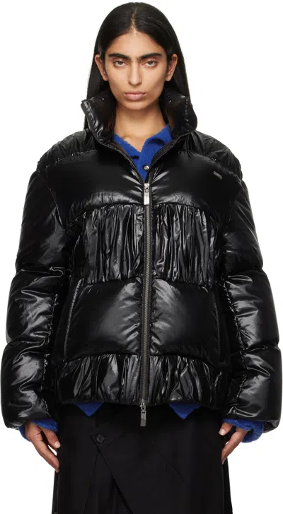 Down-filled and quilted coated nylon taffeta jacket. Gathering throughout. · Stand collar · Two-way zip closure · Logo hardware at chest · Zip pockets · Bungee-style drawstring at hem · Elasticized cuffs · Zip pocket at interior · Full satin lining Supplier color: Noir Fill: 80% duck down, 20% duck feathers.