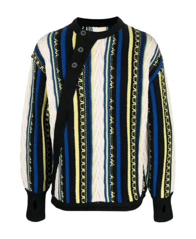 Button detail sweater, knitting structure, rib knitted edge, vertical stripe pattern, logo embossed button, round collar, eccentric front button opening and closing, shoulder fall, long sleeves, straight hem.