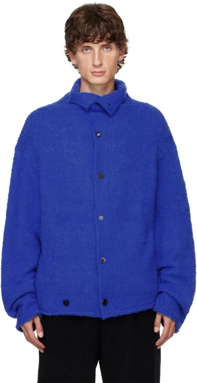 cobalt blue ribbed knit brushed effect bouclé construction front button fastening high neck long sleeves decorative button detailing brooch detail rolled hem When buying this unisex item, keep in mind that it is graded in standard men's sizing.