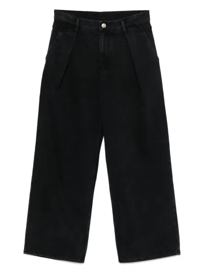 black concealed fly and button fastening belt loops two side slit pockets two rear patch pockets