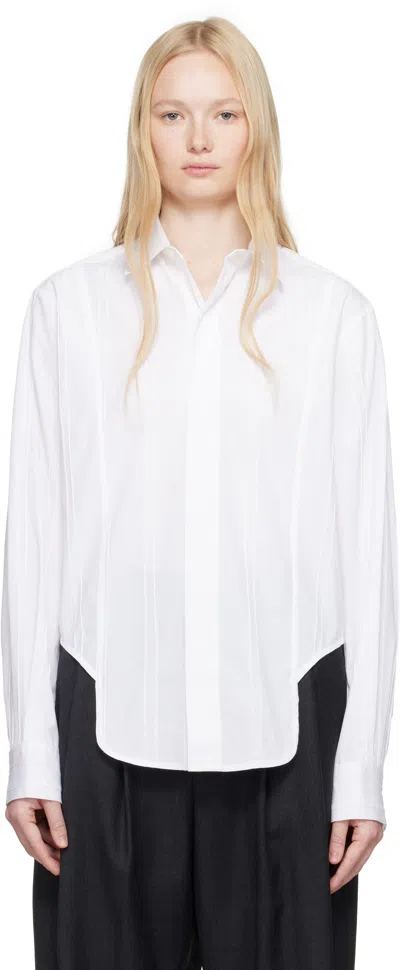 Pinched seam details, lapels, button placket at front, irregular hem, buttoned barrel cuffs, pleat detail, fringed flag flag on back yoke, topstitching detail, I-pleat on back yoke.