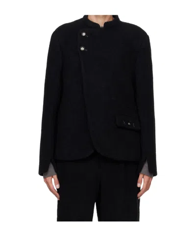 Long sleeves, upright collar, double breasted buttons open and close, welt pockets.