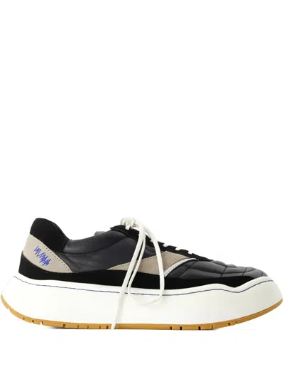 Experience the ultimate fusion of style and sport with our Log Sneakers. Inspired by football shoes, these low-top sneakers feature irregularly quilted leather details on the toe and split shimmering leather on the sides. With a unique patterned counter and intricate zigzag embroidery, these sneakers are a must-have for any trendsetter. | Adererror Men's Log Sneakers in Black | Size 43 | BN01SSSN0102BK