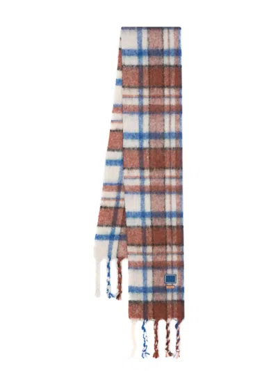 plaid logo-patch scarf from ADER error featuring ivory white, cerulean blue, multicolour, knitted construction, brushed effect, plaid check pattern, logo patch to the front, fringed edge, rectangle shape and wraparound style.